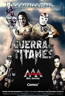 Guerra de Titanes (2009) ("War of the Titans") was the thirteenth annual Guerra de Titanes professional wrestling show promoted by AAA since 1997. The show took place on December 11, 2009 in the Ciudad Madero, Tamaulipas Convention center, a site that AAA has used for many of their major shows.[1] Guerra de Titanes is AAA's "End of year" show and the fifth of their "big shows" they hold every year.[3] The Main Event saw Dr. Wagner Jr. defend the AAA Mega Championship against El Mesias in a Domo De La Muerte cage match.[4][5] The show also featured two AAA championship matches as Nicho el Millonario and Joe Líder defended the AAA World Tag Team Championship and Mini Charly Manson defended the AAA World Mini-Estrella Championship.[6] Furthermore a "Mask vs. Hair", Lucha de Apuesta match between Faby Apache and Sexy Star took place as well.[6] Finally the show featured a Six-man "Lucha Libre rules" tag team match and a four on four "AAA vs. La Legion Extranjera elimination match where the winner would receive a title match for the AAA Mega Championship as AAA's 2010 Rey de Reyes show.[6][7]