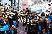 Guggenmusik is played during Fasnacht, the Swabian-Alemannic carnival season (Swabian–Alemannic Fastnacht), which is celebrated in various localities as the Basler Fasnacht, Luzerner Fasnacht, Eis-zwei-Geissebei in Rapperswil, and many other terms. The most common explanation of the word "Gugge" is that it may derive from the Alemannic "Sack/Tüte", meaning "bag". Other unsourced explanations include the word used for a small children's trumpet, a (Swiss German) word for "scream", or the cuckoo's call.[1] A "Guggemusik" band thus refers to a group of people playing loud music and typically wearing costumes and masks in a uniform style.