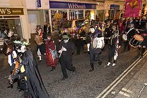 Guise dancers dress in a disguise to hide their identity allowing them to perform in an outlandish or mischievous manner in the hope of receiving payment of food or money.[3] The principal activities associated with guise dancing have changed through time. These have included the performance of Christmas plays such as Duffy and the Devil or St George and the Turkish Knight and traditional Cornish dance, music and song.