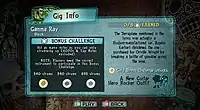 Guitar Hero 5 introduces Career mode Challenges, that are either tied to specific songs, or allow players to select a song to meet the Challenge requirement in "open gigs".[10] These were created by Neversoft to allow the developers to take advantage of unique features of many of songs and provide another layer of gameplay, according to Neversoft's Brian Bright.[11] Each Challenge features three possible completion levels—Gold, Platinum, and Diamond, mimicking the music recording sales certification levels—with Diamond being the most difficult to complete. The song-specific challenges include both instrument-specific challenges, such as correctly vocalizing the repeated "Fame" lyric at the end of David Bowie's "Fame" as it moves down in pitch, and more general scoring or performance challenges on either specific instruments or for the whole band. Open gig Challenges are presented by sponsors within the game, and are based on performance aspects such as scoring a certain number of points using Star Power or using the guitar controller's whammy bar continuously for a length of time. These allow the player to select any song to complete, with some songs potentially being better suited for completing that challenge. The progress towards these Challenges is shown in-game by a record meter that appears when the challenge is active, and fills up similarly to the overall scoring meter as the player successfully completes towards the challenge. Higher completion levels, particularly Diamond, may only be possible by playing the Expert difficulty of a song, but players can take advantage of the mid-song difficulty adjustment feature to complete these if needed.