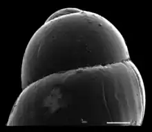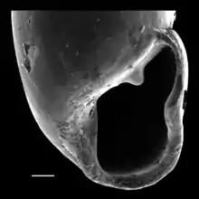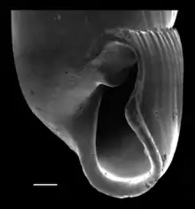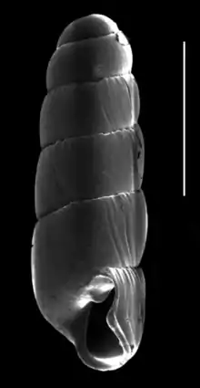 | SEM image of apertural view of paratype of Gulella streptostelopsis. The height of the shell is 2.37 mm. Scale bar is in mm. | |