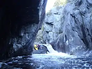 Kayaking Gulf Hagas is best suited for expert, class five, whitewater kayakers. The steep gorge walls can make egress nearly impossible. Gulf Hagas is considered by many to be the best creek run in Maine. The whitewater is unique and of particularly high quality; the deep gorge and waterfalls aren't especially common in Maine. Great scenery, a wide range of boatable flows, waterfalls, and water levels which remain high longer than other runs make Gulf Hagas a classic class 5 kayak run.
