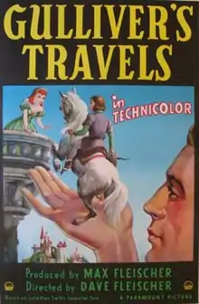 Gulliver's Travels is a 1939 American animated musical fantasy film produced by Max Fleischer and directed by Dave Fleischer for Fleischer Studios.[3] Released to cinemas in the United States on December 22, 1939,[4] by Paramount Pictures, the story is a very loose adaptation of Jonathan Swift's 1726 novel of the same name, specifically only the first part of four, which tells the story of Lilliput and Blefuscu, and centers around an explorer who helps a small kingdom who declared war after an argument over a wedding song. The film was Fleischer Studios' first feature-length animated film, as well as the second animated feature film produced by an American studio after Walt Disney Productions' Snow White and the Seven Dwarfs, as Paramount had commissioned the feature in response to the success of that film.[5] The sequences for the film were directed by Seymour Kneitel, Willard Bowsky, Tom Palmer, Grim Natwick, William Henning, Roland Crandall, Thomas Johnson, Robert Leffingwell, Frank Kelling, Winfield Hoskins, and Orestes Calpini.