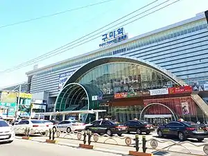 The train station on the Gyeongbu line is between Apo station and Sagok station. On November 1, 1916, the company started operation as a normal station. The station was renovated in 1966 and expanded in 1982. In 2006, the company built a new history of Gumi and stopped handling cargo operation in 2007. KTX, Saemaul and Mugunghwa trains are in operation, and are in charge of passenger and ticket issuance.[1]