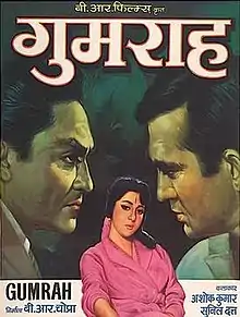 Gumrah (transl. Astray) is a 1963 Hindi-language romantic drama film produced and directed by B. R. Chopra. The film stars Sunil Dutt, Ashok Kumar, Mala Sinha, Nirupa Roy, Deven Verma and Shashikala. The music was composed by Ravi and the lyrics were by Sahir Ludhianvi. The film was a box office success. It was remade in Malayalam as Vivahitha (1970).[1] For her performance, Shashikala won the Filmfare Award for Best Supporting Actress.
