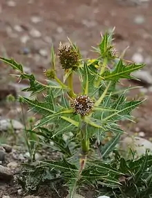 The stem divides into ten or more branches, each of which is topped by a compound spiny ovoid inflorescence of 4–8 cm in diameter, which may be covered in dense arachnoid hairs. This inflorescence is unusual for members of the family Asteraceae, as each true flowerhead is so far reduced as to only contain one floret, which is surrounded by its own involucre. Five to seven of these monofloral flowerheads combine into secondary flowerheads, each subtended by a spiny bract hardly or substantially longer than the secondary flowerheads, with only the centre floret developing a cypsela, and the surrounding ones only producing pollen. These secondary flowerheads later break free from the globose assembly of flowerheads that sit on the end of each branch of the stem during the tumbleweed-stage. Remarkable for a member of the tribe Cichorieae are also the disk florets, a trait that is further only present in Warionia saharae.[7][10]
