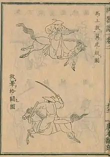 In Zhao Shizhen's book of 1598 AD, the Shenqipu, there were illustrations of Ottoman Turkish musketmen with detailed illustrations of their muskets, alongside European musketeers with detailed illustrations of their muskets.[74] There was also illustration and description of how the Chinese had adopted the Ottoman kneeling position in firing while using European-made muskets,[75] though Zhao Shizhen described the Turkish muskets as being superior to the European muskets.[76] The Wubei Zhi (1621) later described Turkish muskets that used a rack-and-pinion mechanism, which was not known to have been used in any European or Chinese firearms at the time.[77]