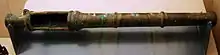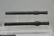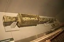 Most early Ming guns weighed two to three kilograms while guns considered "large" at the time weighed around 75 kilograms. During Siege of Suzhou in 1366 the Ming army fielded "large" cannons weighing up to 80 kilograms, which were about a meter in length, and had a muzzle diameter of about 21 centimeters.[7] A gun known as the "Great Bowl-Mouth Tube" (大碗口筒) dated to 1372 weighs only 15.75 kilograms and was 36.5 centimeters long, its muzzle 11 centimeters in diameter. Other excavated guns of this type range from 8.35 to 26.5 kilograms. They were usually mounted on ships or gates as defensive weapons. Accuracy was low and they were limited to a range of only 50 paces or so.[29] Some exceptionally large cannons exist such as three specimens cast in 1377, each around one meter in length, supported by two trunnions on each side, weighing over 150 kg, and with a muzzle diameter of 21 cm.[30][31] A metallographic study of one of these cannons showed that it was likely made of cast steel rather than iron.[32]