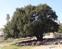 The interim period saw the rise of two movements designed to commemorate the fall of Gush Etzion, through songs, poetry, prose and cultural activities.[25] Both the land of the bloc, and the events that transpired there in the war of 1948, became sacred to the descendants of the original participants. Some compared the story of the yearning to return to the bloc to the story of the Jews yearning to return to the Land of Israel.[26] For 19 years, some survivors would gather on the Israel–Jordan frontier and gaze at the giant oak tree there in remembrance of what was. This became an annual gathering following the Independence Day ceremony (independence day was one day after the bloc had fallen). Poems and stories were written that humanized the lone tree. This was criticized by the novelist Haim Be'er, who called the bloc's settlement movements a "fervent cult" and compared them to the Canaanites.[26]