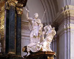 The 15 metres (49 ft) high altarpiece was designed and built by Burchard Precht in his workshop between 1728 and 1731. It is Sweden's largest sculptural work in the Baroque style, originally created for the Uppsala Cathedral. Stored away at the Skansen museum for several years, it finally ended up at the Gustaf Vasa Church in 1906.[2][3]