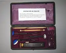Gustave Trouvé took part in the improvement in communication systems with several noteworthy innovations. In 1870, he developed a device for locating metal objects such as bullets in human patients.[7] It used electric conduction, but unlike the one made by Professor Favre in 1862, Trouvé's buzzer made a different sound for lead and iron.[8] In 1872 he developed a portable military telegraph whose cabling enabled rapid communication up to a distance of one kilometer, enabling the swift transmission of both orders and reports back from the Front.[9] In 1878, he improved the sound intensity of Alexander Graham Bell’s telephone system by incorporating a double membrane. The same year he invented a highly sensitive portable microphone. Trouvé soon came to be known and respected by his talent for miniaturization. The same year, using a battery developed by Gaston Planté, and a small incandescent airtight bulb, he innovated a "polyscope", the prototype of today’s endoscope.[10]