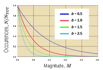 The parameter b (commonly referred to as the "b-value") is commonly close to 1.0 in seismically active regions. This means that for a given frequency of magnitude 4.0 or larger events there will be 10 times as many magnitude 3.0 or larger quakes and 100 times as many magnitude 2.0 or larger quakes. There is some variation of b-values in the approximate range of 0.5 to 2 depending on the source environment of the region.[5] A notable example of this is during earthquake swarms when b can become as high as 2.5, thus indicating a very high proportion of small earthquakes to large ones.