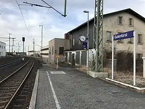 Gutenfürst station is the station of Weischlitz district of Gutenfürst in the German state of Saxony. The station on the Leipzig–Hof railway was opened as early as 1848, but it gained greater importance only after the Second World War. Gutenfürst was divided from 1945 to 1990 between the American and the Soviet occupation zones and later between West Germany and East Germany. Today only local trains stop here.