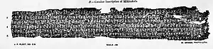 The inscription was found by Cunningham, who published it in 1861. Rajendralala Mitra published its first interpretation and translation in 1862. At this time, nine lines of text were extant on the broken slab. The inscription was damaged, with first 2-3 characters of every line lost. After its discovery, more lines were lost before the slab was removed and shifted to the Imperial Museum at Calcutta (Indian Museum, Kolkata). Now only seven lines can be studied.[1] John Faithfull Fleet published an interpolated version of this inscription, and a translation of the reconstructed inscription in 1888.[3] It was subsequently noted by Bhandarkar, Garde, Dvivedī and Willis in their respective epigraphic lists.[4] An edition was published by D. C. Sircar in his Select Inscriptions.[5]
