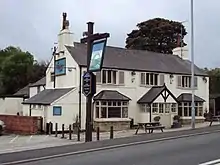 The Rainbow Inn was a well known feature at the top of Gwernymynydd hill for motorists heading west. It was demolished in 2019 as part of a new housing development. As a condition of the planning permission, in order to retain the landmark, the Inn building was replaced by housing of a similar appearance and footprint.[8]