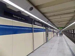 Gyöngyösi utca (Gyöngyösi Street) is a station on the Budapest Metro Line 3 (North-South). It is located under Váci út at its intersection with the streets Gyöngyösi utca and Meder utca.[2] The station was opened on 14 December 1990 as part of the extension from Árpád híd.[3]