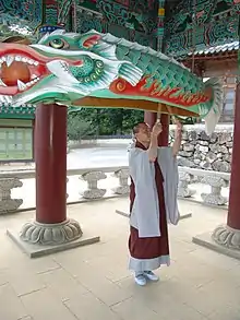 A wooden fish, also known as a Chinese temple block, wooden bell, or muyu, is a type of woodblock that originated from East Asia that is used by monks and lay people in the Mahayana tradition of Buddhism.[1][2][3][4] They are used by Buddhist ceremonies in China, Korea, Japan, Vietnam and other Asian countries. They may be referred to as a Chinese block, Korean block or, rarely, as a skull.[5]