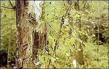 Since 1980, the gypsy moth has defoliated over one million acres (4,000 km2) of forest each year. In 1981, 12.9 million acres (52,200 km2) were defoliated. In wooded suburban areas, during periods of infestation, gypsy moth larvae crawl over man-made obstacles and sometimes enter homes.[4] When feeding, they leave behind a mixture of small pieces of leaves and frass, or excrement. During outbreaks, the sound of caterpillars chewing and dropping frass may be loud enough to sound like light to moderate rainfall.[5] Gypsy moth populations usually remain low, but occasional increases to very high levels can result in partial or total defoliation of host trees.[6]