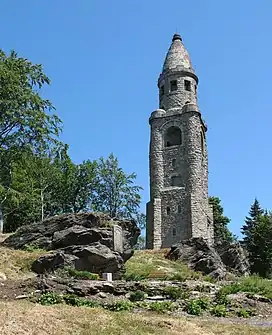A 34-metre-high (112 ft) stone observation tower on the summit was built in 1902–1904. It was designed by the Dresden architect Wilhelm Kreis. The tower bore name of Otto von Bismarck until 1946, when it was renamed Háj u Aše.[2] The tower still stands and is one of the three Bismarck towers on the territory of the Czech Republic.[4]