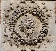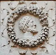 These Renaissance arcades featuring portrait medallions were commissioned by the merchant Jean de Nolet in 1542 and executed by the sculptor Nicolas Bachelier. Their framework, featuring a floral wreath (referred to as a 'triumphal garland' in the surviving documents), draws on Roman triumphs (laurel), as well as the arms of the sixteenth-century merchant: "On azure two palms or in saltire, surmounted by a wreath of roses proper on a fesse, ribboned argent and between three stars same, two borne in chief and one in point".[1]