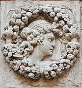 The portrait medallions in the courtyard are typical of the Renaissance, they celebrate the human figure. This iconography draws its inspiration from the coins minted under various Roman emperors, gravestones and the decorative elements of classical shields. This theme enjoyed great success in the first half of the sixteenth century, permeating all the arts. The six original profiles still extant on Hôtel Thomas de Montval depict the faces of a Moor, a king, a wreathed emperor, a man in sixteenth century fashion and two characters in Roman garb. Nicolas Bachelier's style is noticeable for the prominent arches of the eyebrows and the often very thick lips of his figures.[1]