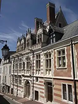 Under Louis XII the courtesans of France settled in Blois from 1498 to 1515, and the city became the capital of the Kingdom of France. As a result, many people purchased residences in Blois and the Loire Valley.[4] Named after Robertet's barony of Alluyes, construction of the Hôtel d'Alluye began in 1498[5] or 1500[3] and was completed in 1508. It was built during his tenure as secretary and notary to Louis XII,[4] and a diplomatic document from the Republic of Florence described the hôtel as new in September 1508.[3][6] The hôtel particulier is an example of French Renaissance architecture; this, coupled with its ornamentation, were intended to reflect the tastes of Robertet, who was well known for his artistic collections.[7] One of the first examples of Renaissance architecture in Blois, the hôtel indicates the influence of the Quattrocento on him.[4]