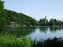The monastery with its rococo church on a peninsula in Lake Höglwörth represents one of the finest ensembles in the eastern Upper Bavaria. The church was rebuilt from 1675. The choir was preserved from the Romanesque church.[2] Before silting to the east the monastery was on an island, but it is now on a peninsula.[3] Wörth is an old word for island, and it is still shown as an island on the field map from the 19th century.[4]