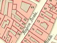 The property No. 65 was owned by hatter Johan Christ.Viertel at the time of the 1787 census. He resided on his property with his wife Maria Magdalena Jacobine Viertel, their three children (aged eight to 16), his mother-in-law Johanna Rachel Douilhac, two maids, a boy, a caretaker and two lodgers.[2] The property No. 66 was home to 17 residents in two households. Heiman Joseph, a guldtrækker, resided in the building with his wife Judithe Joseph, their three children (aged 22 to 28), the eldest son Phillip Heiman Joseph's wife Helle Phillip, their four children (aged one to five) and three maids.[3] Chresten Nielsen, a pottery seller, resided in the building with his wife Elisabeth Nielsen, their 11-year-old daughter and a 77-year-old widow.[4]
