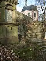 The oldest document pertaining to the Hülfensberg is a papal deed from 1351,[13] which names the parish St. Salvator auf dem Stuffenberg.[6] A later deed naming the location is dated 30 May 1352; at this time the Hülfensberg belonged to the St. Martin monastery in Heilbad Heiligenstadt, which in turn handed over the patronage to the Cistercian monastery of Anrode in 1357.[6] Pilgrimages to the Hülfenskreuz, found at the church's Gnadenaltar, started from Anrode.[6]