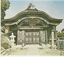 The Hogon-ji Temple is located on the sacred Chikubu Island in Shiga Prefecture, Japan. It is part of a temple complex on the revered island. It is a Buddhist temple dedicated to the goddess Benzaiten. Also, it is said to have first been built in 724 CE under the order of Emperor Shōmu.[1] The temple has been rebuilt a few times over the years, with a major rebuilding around 1602 CE by the Japanese court officials Toyotomi Hideyori and Toyotomi Hideyoshi.[1] The temple looks to be of Amida style architecture.[2] The temple's gate is originally from the Toyokuni Shrine in Kyoto, but was moved to Chikubu Island during the renovations in 1602. The artwork on the temple's gate has features reminiscent of the Momoyama Period.[3]