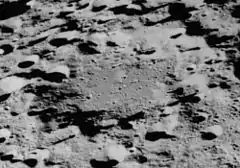 This large formation is most notable for the extremely battered state of its outer rim. Little or nothing remains of the original rim, so completely has it been eroded and incised by smaller craters. As a result, the crater floor is now surrounded by a ring of irregular peaks and worn crater valleys. This rugged surroundings intrudes only part way into the interior, while the remaining floor is relatively level and in some places gently rolling. The interior is marked only by a multitude of tiny craters.