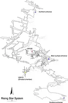 The chamber had been entered at least once before, by cavers in the early 1990s. They rearranged some bones and may have caused further damage, although much of the floor in the chamber had not been walked on prior to 2013.[5] It lies about 80 m (260 ft) from the main entrance, at the bottom of a 12 m (39 ft) vertical drop, and the 10 m (33 ft) long main passage is only 25–50 cm (10 in – 1 ft 8 in) at its narrowest.[5] In total, more than 1,550 pieces of bone belonging to at least fifteen individuals (9 immature and 6 adults[6]) have been recovered from the clay-rich sediments. Berger and colleagues published the findings in 2015.[7]