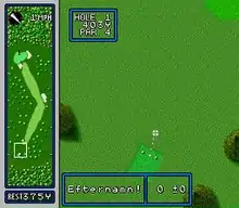 The game is essentially a standard 18-hole golf video game, which is played from a top-down perspective. Players can compete in stroke play with up to four players, or match play against a friend or the computer, in which case the player is in a competitive match against Hal.[6] Players can enter up to four characters (letters and numbers) for their name. When playing against the computer, the player will play against an opponent that uses metal clubs, which hit farther than the standard wooden clubs. Wind speeds are shown in meters per second. Water hazards notifications appear in big gray letters.