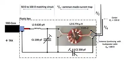 The HB9XBG antenna is based on the use of a speaker audio cable with a strand cross-section of 2 × 2.5 mm2 and PVC insulation. A speaker cable of this kind has a impedance of almost exactly 100 Ω and performs two functions at the same time: the function of the feedline as far as the centre of the dipole and the function of the "radiating common mode current" for the lower dipole leg. One core of the two-core cable is removed on the upper half of the dipole. A resonant trap L2/C2 eliminates the common mode current at the lower end of the antenna.[2] The L1/C1 components (see the illustration) matches the feedline impedance of 50 Ω to the 100 Ω system of the antenna.