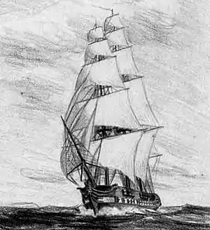 From 24 August 1840 to 21 August 1841, under command of captain Christian Wulff,[5] she completed a voyage to South America.[1] The primary purpose of this voyage was the establishment of trade agreements with the South American states, but also to establish contact to emigrated Danish citizens and in general fly the Danish flag in the new world. Scientific expeditions were also in fashion (not the least the recently completed voyage of HMS Beagle 1831-36 with Charles Darwin on board) and the Danish King Christian VIII had a keen interest for natural sciences. Thus on board Bellona was the 41 year old naturalist Henrik Nikolai Krøyer. Almost nothing is known from direct sources about Krøyer's work on Bellona, but indirectly from his later scientific publications it is evident that he collected a wealth of animals, in particular crustaceans.[6]