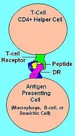 HLA-DR molecules are upregulated in response to signalling. In the instance of an infection, the peptide (such as the staphylococcal enterotoxin I peptide) is bound into a DR molecule and presented to a few of a great many T-cell receptors found on T-helper cells. These cells then bind to antigens on the surface of B-cells stimulating B-cell proliferation.