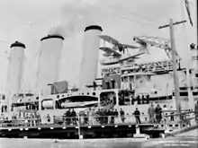 On 31 August 1954, Australia was paid off and marked for disposal.[140] She had been in service for 26 years, the longest career of a RAN warship to that date.[141] The ship was sold on 25 January 1955 to the British Iron & Steel Corporation for scrapping.[140] On 26 March, the cruiser was towed from Sydney Harbour by the Dutch-flagged tugboat Rode Zee.[140] The ships were later joined by two other tugs for the voyage to Barrow-in-Furness via the Suez Canal, where they arrived on 5 July.[134] Australia was broken up at Thos. W. Ward's Shipbreaking Yard at Barrow-in-Furness over the course of 1956.[11]