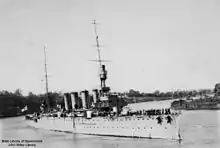 The cruiser's primary armament consisted of eight BL 6-inch (152.4 mm) Mk XI* guns, arranged in single mountings behind open-backed gunshields.[4] A single quick-firing 3-inch (76 mm) gun was used to protect the ship from air attack.[4] Brisbane carried a 12-pounder field gun for ashore deployment.[4] Four 3-pounder (47-mm, 1.9-in) quick-firing Hotchkiss guns were used as saluting guns.[4] Ten .303-inch machine guns were carried for close defence work (eight Lewis guns and two Maxim guns).[4] Two submerged 18-inch (450-mm) torpedo tubes were fitted: one on each side, firing broadside.[4] Armour plating consisted of side belts 3-inch (76 mm) thick amidships, tapering to 1.5-inch (38 mm) thick at the bow and stern, along with protective decking over the engineering and magazine spaces, and an armoured conning tower.[3]