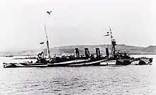 By the time she reached the Azores on 12 December, Melbourne had been reassigned to Bermuda as part of the North America and West Indies Station.[2] While on the Station, the cruiser patrolled the western Atlantic from Canada to Brazil. In August 1916, she sailed for Devonport in England, where she spent a month before joining the 2nd Light Cruiser Squadron of the British Grand Fleet, stationed at Scapa Flow.[2] From January until June 1917, Melbourne was docked at Birkenhead for major repairs to her propulsion system.[2] The cruiser was fitted with an aeroplane platform in November 1917.[6] On 1 June 1918, Melbourne launched her aircraft after sighting German aircraft over Heligoland Bight, but the pilot lost his target in the clouds.[6] At the surrender of the German High Seas Fleet, Melbourne was assigned to escort SMS Nürnberg.[6] The cruiser remained with the Grand Fleet until 30 November 1918: during the entire war, Melbourne was not involved in any sea battles.[2] Initially, the cruiser was not awarded any battle honours, but a reorganisation of the RAN honours system published in 2010 retroactively awarded the honours "Rabaul 1914" and "North Sea 1916–18" to the ship.[7][8]
