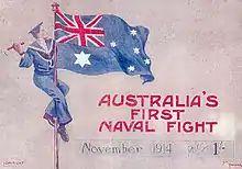 When World War I started, Sydney was north-bound to join Admiral George Patey and the battlecruiser HMAS Australia.[2] The ships were quickly assigned to protect the Australian Naval and Military Expeditionary Force, which was used to capture German colonial assets in the region; Sydney participated in operations against Rabaul and Anguar Island in September.[2] In October, Sydney and sister ship HMAS Melbourne left Patey's squadron for Sydney, where they joined the escort of the first convoy delivering Australian and New Zealand soldiers to Egypt.[2] The convoy sailed around the southern coast of Australia to Albany, then departed on 1 November for Colombo.[2]