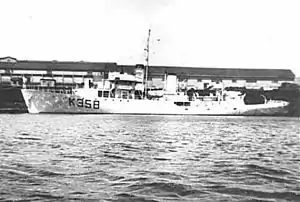 Flower-class corvettes like Asbestos serving with the Royal Canadian Navy during the Second World War were different from earlier and more traditional sail-driven corvettes.[2][3][4] The "corvette" designation was created by the French as a class of small warships; the Royal Navy borrowed the term for a period but discontinued its use in 1877.[5] During the hurried preparations for war in the late 1930s, Winston Churchill reactivated the corvette class, needing a name for smaller ships used in an escort capacity, in this case based on a whaling ship design.[6] The generic name "flower" was used to designate the class of these ships, which – in the Royal Navy – were named after flowering plants.[7]