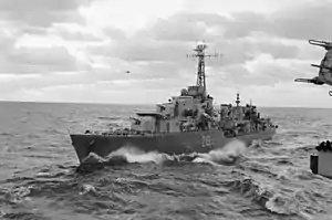 Following Korea, Athabaskan underwent a major refit, recommissioning on 25 October 1954 as a destroyer escort.[5] On 1 January 1955, Athabaskan was assigned to the Second Canadian Escort Squadron of Pacific Command.[6] In November 1955, the Second Canadian Escort Squadron was among the Canadian units that took part in one of the largest naval exercises since the Second World War off the coast of California.[7] She returned to her training mission which lasted until January 1959. That month, she transferred to the east coast where she became part of the destroyer squadron made up of the Tribal-class destroyers in the Royal Canadian Navy. She spent the next five years on training cruises with occasional North Atlantic Treaty Organization (NATO) exercises. Athabaskan was placed in reserve in 1964 at Halifax.[2]