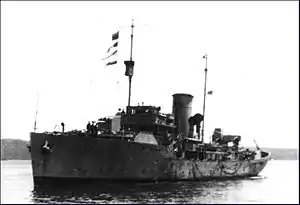 Flower-class corvettes like Baddeck serving with the Royal Canadian Navy during the Second World War were different from earlier and more traditional sail-driven corvettes.[3][4][5] The "corvette" designation was created by the French as a class of small warships; the Royal Navy borrowed the term for a period but discontinued its use in 1877.[6] During the hurried preparations for war in the late 1930s, Winston Churchill reactivated the corvette class, needing a name for smaller ships used in an escort capacity, in this case based on a whaling ship design.[7] The generic name "flower" was used to designate the class of these ships, which – in the Royal Navy – were named after flowering plants.[8]