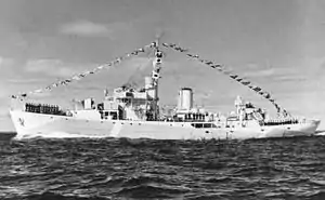 Flower-class corvettes like Belleville serving with the Royal Canadian Navy during the Second World War were different from earlier and more traditional sail-driven corvettes.[2][3][4] The "corvette" designation was created by the French as a class of small warships; the Royal Navy borrowed the term for a period but discontinued its use in 1877.[5] During the hurried preparations for war in the late 1930s, Winston Churchill reactivated the corvette class, needing a name for smaller ships used in an escort capacity, in this case based on a whaling ship design.[6] The generic name "flower" was used to designate the class of these ships, which – in the Royal Navy – were named after flowering plants.[7]