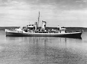 Flower-class corvettes like Chicoutimi serving with the Royal Canadian Navy during the Second World War were different from earlier and more traditional sail-driven corvettes.[3][4][5] The "corvette" designation was created by the French as a class of small warships; the Royal Navy borrowed the term for a period but discontinued its use in 1877.[6] During the hurried preparations for war in the late 1930s, Winston Churchill reactivated the corvette class, needing a name for smaller ships used in an escort capacity, in this case based on a whaling ship design.[7] The generic name "flower" was used to designate the class of these ships, which – in the Royal Navy – were named after flowering plants.[8]