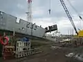 In the conversion to a helicopter-carrying vessel, Fraser was gutted except for machinery and some forward spaces. The hull was strengthened, fuelling facilities for the helicopter and activated fin stabilizers installed. The fin stabilizers were to reduce roll in rough weather during helicopter operations.[11] All seven St Laurents were fitted with helicopter platforms and SQS 504 Variable Depth Sonar (VDS). The single funnel was altered to twin stepped funnels to permit the forward extension of the helicopter hangar.[7] To make room for the helicopter deck, the aft 3-inch mount and one of the Limbos were removed.[11][12] The two 40 mm guns were also removed.[12] Following the conversion, the displacement remained the same at standard load but at full load, it increased to 3,051 tonnes (3,003 long tons).[6]