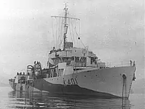 Flower-class corvettes like Louisburg serving with the Royal Canadian Navy during the Second World War were different from earlier and more traditional sail-driven corvettes.[2][3][4] The "corvette" designation was created by the French as a class of small warships; the Royal Navy borrowed the term for a period but discontinued its use in 1877.[5] During the hurried preparations for war in the late 1930s, Winston Churchill reactivated the corvette class, needing a name for smaller ships used in an escort capacity, in this case based on a whaling ship design.[6] The generic name "flower" was used to designate the class of these ships, which – in the Royal Navy – were named after flowering plants.[7]
