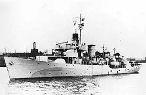 Flower-class corvettes like Mimico serving with the Royal Canadian Navy during the Second World War were different from earlier and more traditional sail-driven corvettes.[3][4][5] The "corvette" designation was created by the French as a class of small warships; the Royal Navy borrowed the term for a period but discontinued its use in 1877.[6] During the hurried preparations for war in the late 1930s, Winston Churchill reactivated the corvette class, needing a name for smaller ships used in an escort capacity, in this case based on a whaling ship design.[7] The generic name "flower" was used to designate the class of these ships, which – in the Royal Navy – were named after flowering plants.[8]