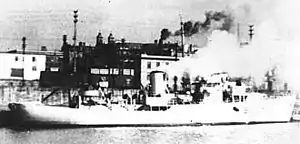 Flower-class corvettes like North Bay serving with the Royal Canadian Navy during the Second World War were different from earlier and more traditional sail-driven corvettes.[2][3][4] The "corvette" designation was created by the French as a class of small warships; the Royal Navy borrowed the term for a period but discontinued its use in 1877.[5] During the hurried preparations for war in the late 1930s, Winston Churchill reactivated the corvette class, needing a name for smaller ships used in an escort capacity, in this case based on a whaling ship design.[6] The generic name "flower" was used to designate the class of these ships, which – in the Royal Navy – were named after flowering plants.[7]