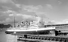 In 1932 the ship was chartered for extended cruises from Boston, Massachusetts and New York City to destinations such as Bermuda, ports in South America and Hawaii.[2] It was not until 1935 that Prince Robert began seeing more regular service when the ship began to make 11-day cruises to Skagway, Alaska.[5] The 11-day cruises began in Vancouver, stopping in Prince Rupert, British Columbia, Sitka, Ketchikan and Juneau, Alaska, before arriving at Skagway. From November through February each year, Skagway froze over during winter and Prince Robert was laid up for overhaul.[8] The three sister ships were considered economic failures for Canadian National, with their arrival coinciding with the Great Depression. Their failure was one of the contributing factors in the resignation of the president of Canadian National, Sir Henry Thornton. The ships were expensive to operate and did not generate new business.[5][9] In mid-1939, Prince Robert was chosen to act as a royal yacht during the visit of King George VI and Queen Elizabeth to British Columbia. They embarked aboard Prince Robert at Vancouver and were accompanied by a naval escort to their disembarkation site at Victoria.[5]
